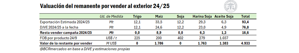 Teniendo en cuenta este volumen, se estima que «el valor total del trigo, el maíz, y el poroto, la harina y el aceite de soja que resta vender al exterior para cumplir con la proyección exportadora estimada para la campaña alcanza a US$ 4.933 millones», sostuvo la BCR.
