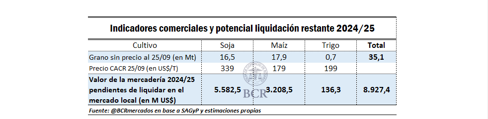 «Si al volumen de granos que resta comprar a la industria y a la exportación le sumamos el volumen de mercadería comprada que a la fecha no se le ha puesto un precio en firme, promediando septiembre el stock de trigo, soja y maíz que o bien no había sido vendido o bien aún permanecía con precio pendiente de fijación ascendía a 35,1 millones de toneladas», detalló la BCR.