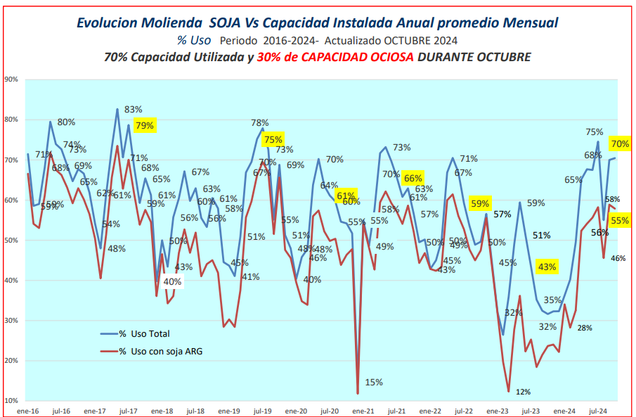 Así, la industria se vio obligada a aumentar las importaciones de soja para mantener los altos niveles de molienda y sostener el uso de la capacidad instalada de las plantas.