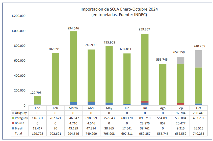 Ese mes se caracterizó por un fuerte incremento de las importaciones de soja provenientes de Uruguay (128% en relación a septiembre), alcanzando las 230.338 toneladas. La soja importada de Paraguay continúa siendo el principal origen de las importaciones para la industria aceitera, con 483.292 toneladas, por lo que el volumen total comprado al exterior se ubicó en 740.255 toneladas.