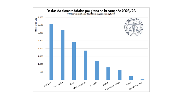 Así, la inversión total se distribuiría de la siguiente manera: US$ 5.042 millones en maíz, US$ 4.783 millones en soja, US$ 2.416 millones en trigo, US$ 787 millones en girasol, US$ 633 millones en cebada cervecera, US$ 227 millones en sorgo y US$ 27 millones en cebada forrajera.