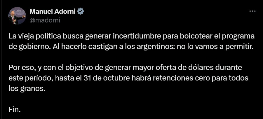 El vocero presidencial, Manuel Adorni, anunció esta medida en su cuenta oficial de X: “Con el objetivo de generar mayor oferta de dólares durante este período, hasta el 31 de octubre habrá retenciones cero para todos los granos”.