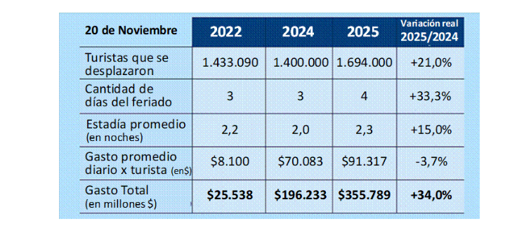 Según indicó la Confederación Argentina de la Mediana Empresa (CAME), el feriado de cuatro días de noviembre permitió un aumento del 21% en el número de turistas que viajaron, con un crecimiento real del 34% en el gasto total frente al mismo período del año pasado.