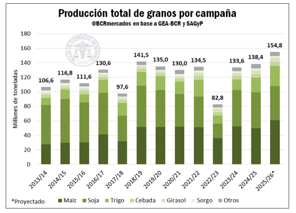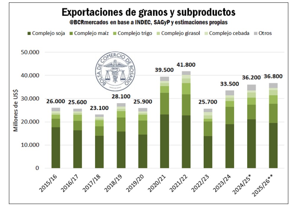 Si se concreta el volumen proyectado por la BCR, Argentina podría exportar un total de 110 millones de toneladas entre granos y subproductos —harinas, aceites y biocombustibles—, volumen que “podría llegar a convertirse en la mayor marca histórica para el país”.