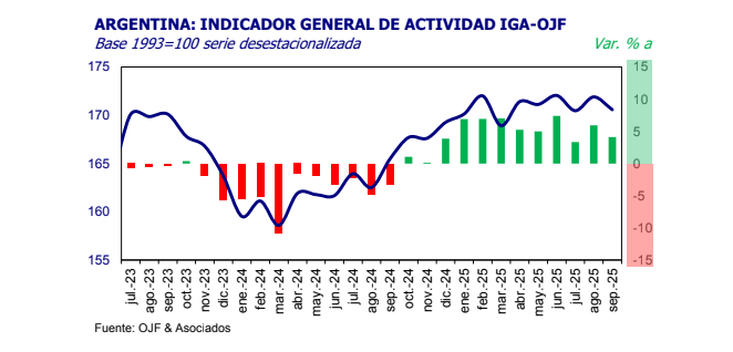 En términos interanuales, el IGA mostró un avance de 4,1% en septiembre, impulsado por el desempeño positivo del sector financiero y de petróleo y minería, este último beneficiado por un salto del 13,6% en la producción de crudo. En contraste, la industria manufacturera volvió a ser el principal freno de la actividad, reflejando el impacto de la baja demanda interna y las dificultades en el acceso al financiamiento.