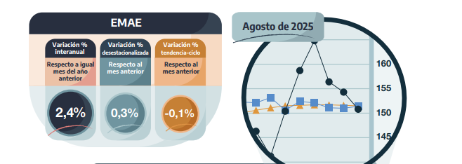 De esta manera, el Instituto Nacional de Estadística y Censos (Indec) informó que el nivel de actividad de la economía (EMAE) mejoró en agosto 2,4% interanual, mientras que avanzó respecto a julio un 0,3%.