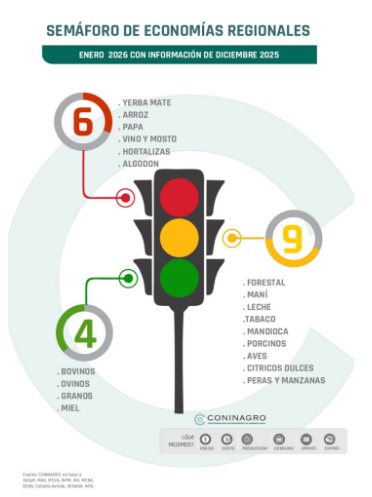 Por último, las producciones en amarillo fueron forestal, maní, leche, tabaco, cítricos dulces, mandioca, peras y manzanas, aves y este mes se sumó la actividad porcina.