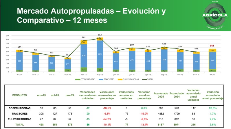 Acara señaló que la desaceleración abarcó los tres segmentos principales de maquinaria, aunque con impactos dispares. Entre ellos, los tractores fueron los que más empujaron la caída mensual: retrocedieron 6,8% frente a octubre y 15,9% en la comparación anual, con 427 unidades vendidas.