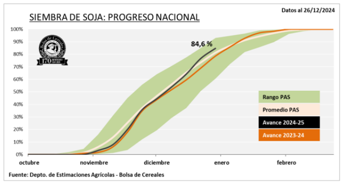 Según informó la entidad bursátil, la siembra de soja ya cubrió el 84,6 % de la superficie proyectada a nivel nacional, marcando un adelanto interanual de 6,1 puntos porcentuales (pp).